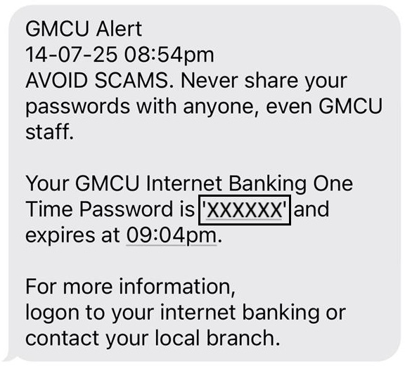 Don’t disclose this code to anyone, even GMCU staff (Tip: scammers will often impersonate bank staff to get access to your accounts).